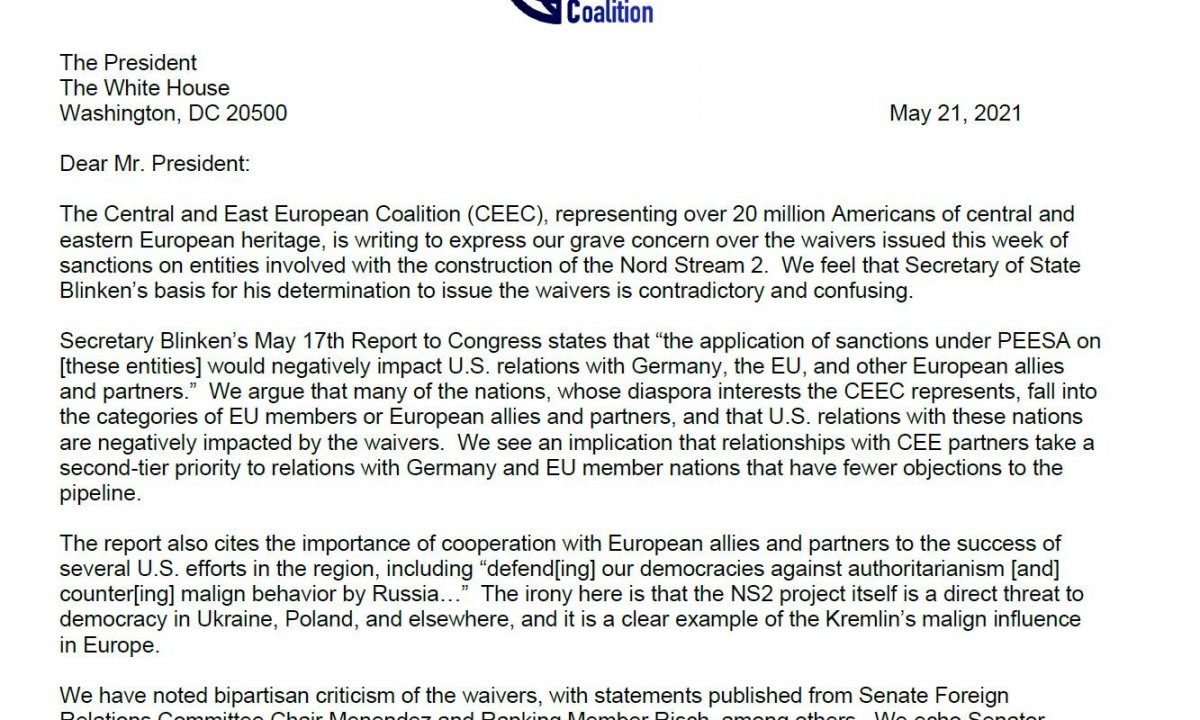 CEEC Warns Administration on Dangers of NordStream2 Sanction Waivers