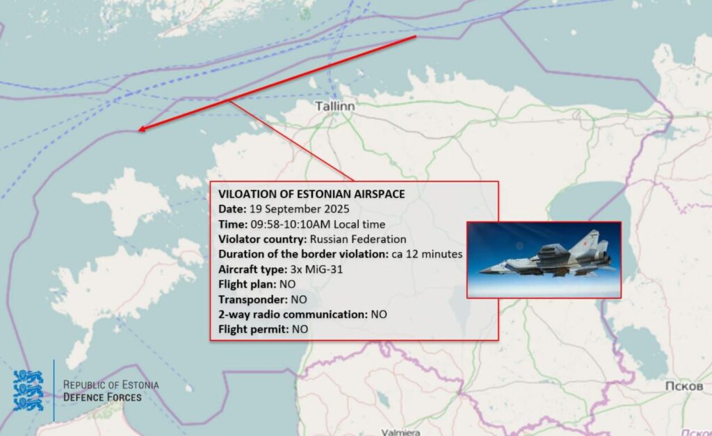 (For immediate release.) The Estonian American National Council condemns Russia’s violation of Estonia’s airspace on September 19, as well as airspace violations against Poland and Romania earlier in the week. Shortly before 10 am last Friday, three (3) Russian fighter jets crossed into Estonian airspace on their way from St. Petersburg to Kaliningrad. These MiG-31 warplanes came within 9 kilometers of Estonia’s capital, Tallinn. The piloted aircraft spent a full 12 minutes in Estonian airspace in a clear act of provocation that could not have been an accident or mistake.