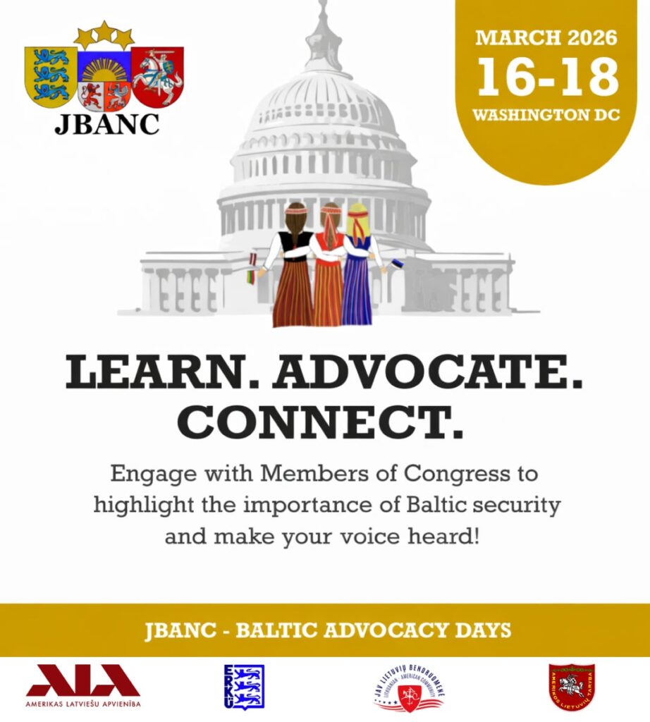 The Joint Baltic American National Committee (JBANC) hosts the 9th annual Baltic Advocacy Days in Washington, D.C., from March 16 – 18, 2026. During Advocacy Days, Baltic Americans and friends of the Baltics meet with their congressional offices to support strengthening the U.S.–Baltic security relationship and curbing Russian aggression. Advocacy Days is not only an opportunity to inform congressional offices about the importance of Baltic security issues, but also a celebration of the Baltic diaspora and the policy stakeholders in Washington who work to build a strong U.S.–Baltic relationship.