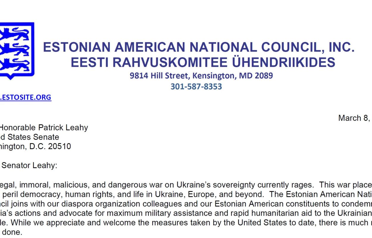 March 25, 2022The Estonian American National Council (EANC) has been engaged for the last several weeks in advocating for U.S. support for humanitarian aid and security assistance in response to the war in Ukraine. It has also called for increased defense funding to Estonia, Latvia, and Lithuania as the risk grows of the Kremlin’s aggression turning to the Baltic nations. EANC’s work has been conducted in close cooperation with our colleagues in the Joint Baltic American National Committee (JBANC) and the Central and East European Coalition (CEEC), and most notably with our Ukrainian colleagues in our CEEC sister organization, the Ukrainian Congress Committee of America (UCCA).
