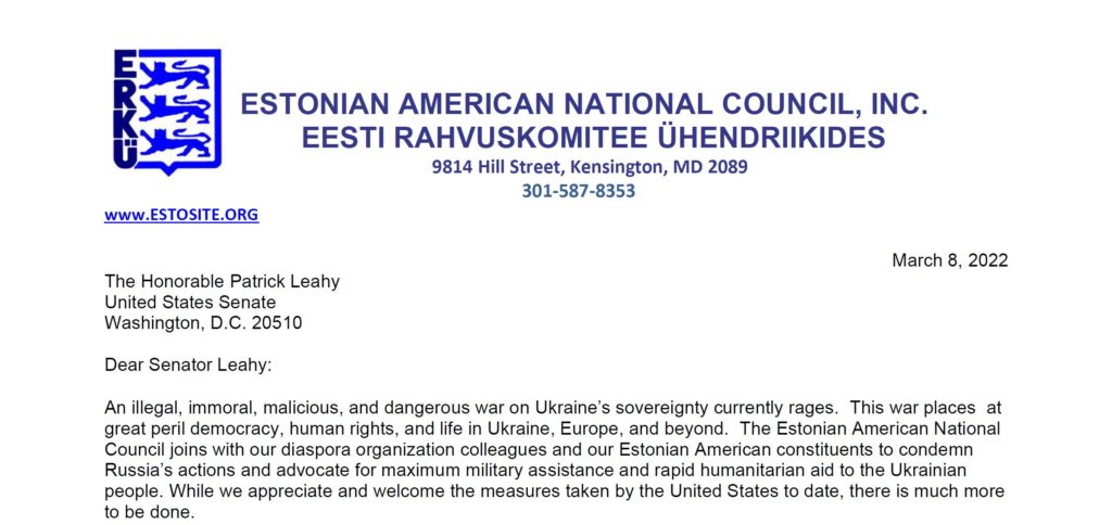 March 25, 2022The Estonian American National Council (EANC) has been engaged for the last several weeks in advocating for U.S. support for humanitarian aid and security assistance in response to the war in Ukraine. It has also called for increased defense funding to Estonia, Latvia, and Lithuania as the risk grows of the Kremlin’s aggression turning to the Baltic nations. EANC’s work has been conducted in close cooperation with our colleagues in the Joint Baltic American National Committee (JBANC) and the Central and East European Coalition (CEEC), and most notably with our Ukrainian colleagues in our CEEC sister organization, the Ukrainian Congress Committee of America (UCCA).
