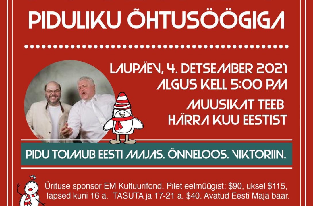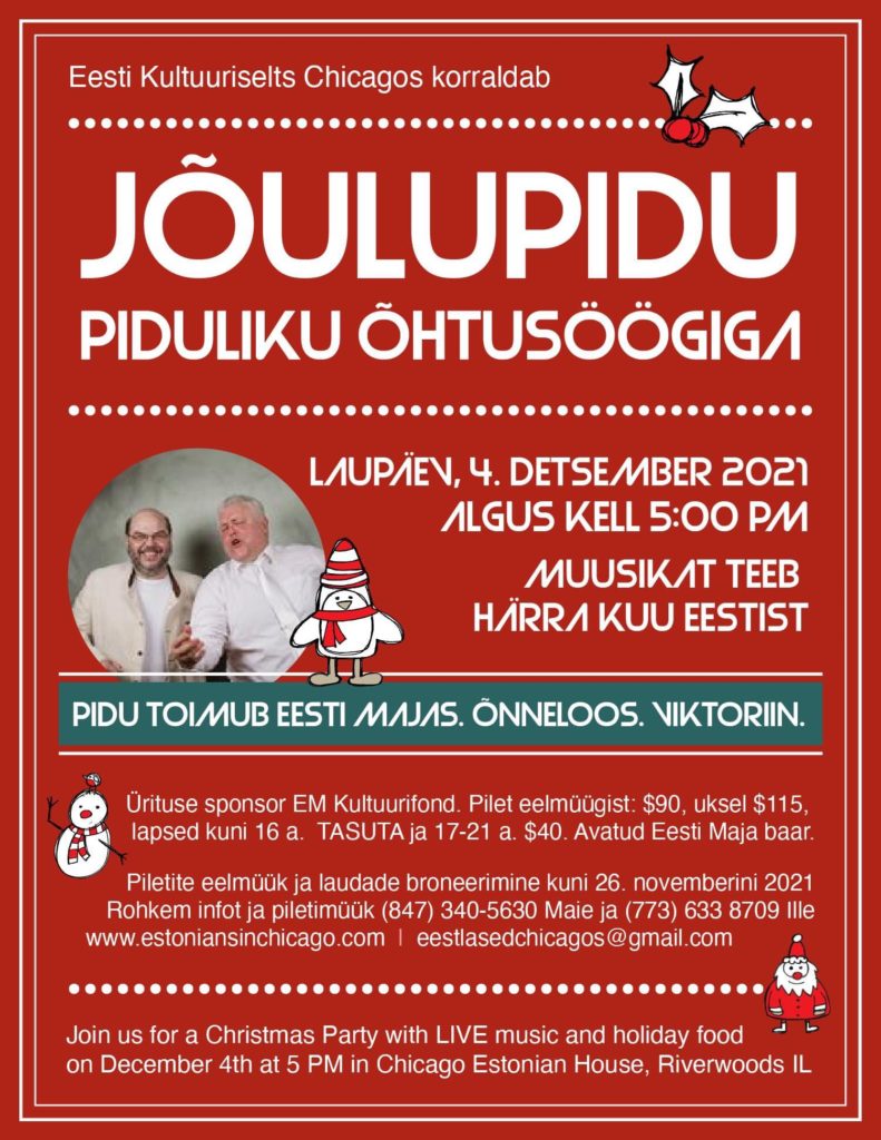 November 23, 2021 November 23, 2021Christmas Party hosted by Estonian Cultural Society of ChicagoCome and celebrate 2021 Christmas 2021 with other Estonians at the Chicago Estonian House. Live music by the band Härra Kuu, from Estonia. Traditional Estonian holiday food and much more. RSVP to Maie (847) 340 […]